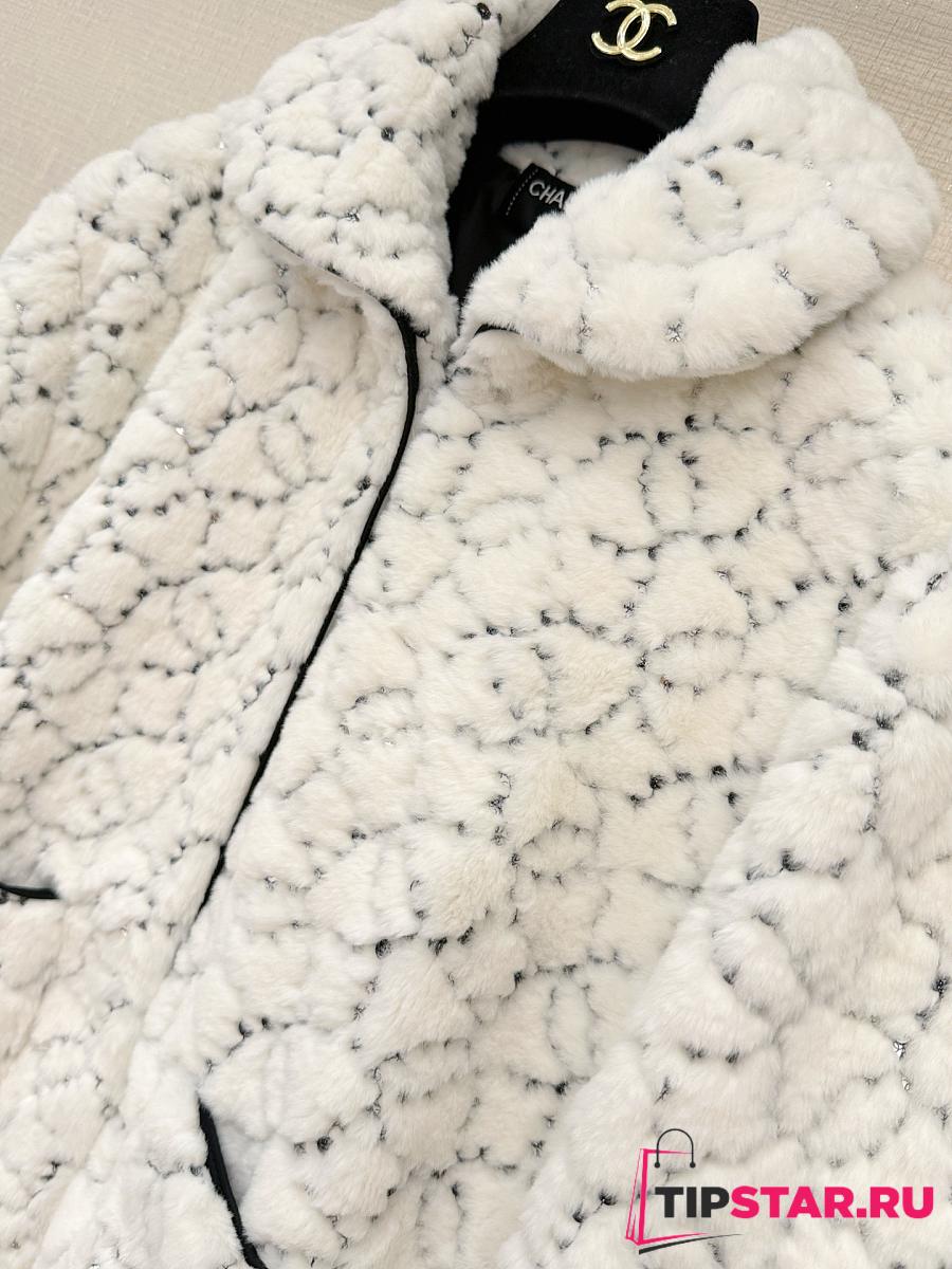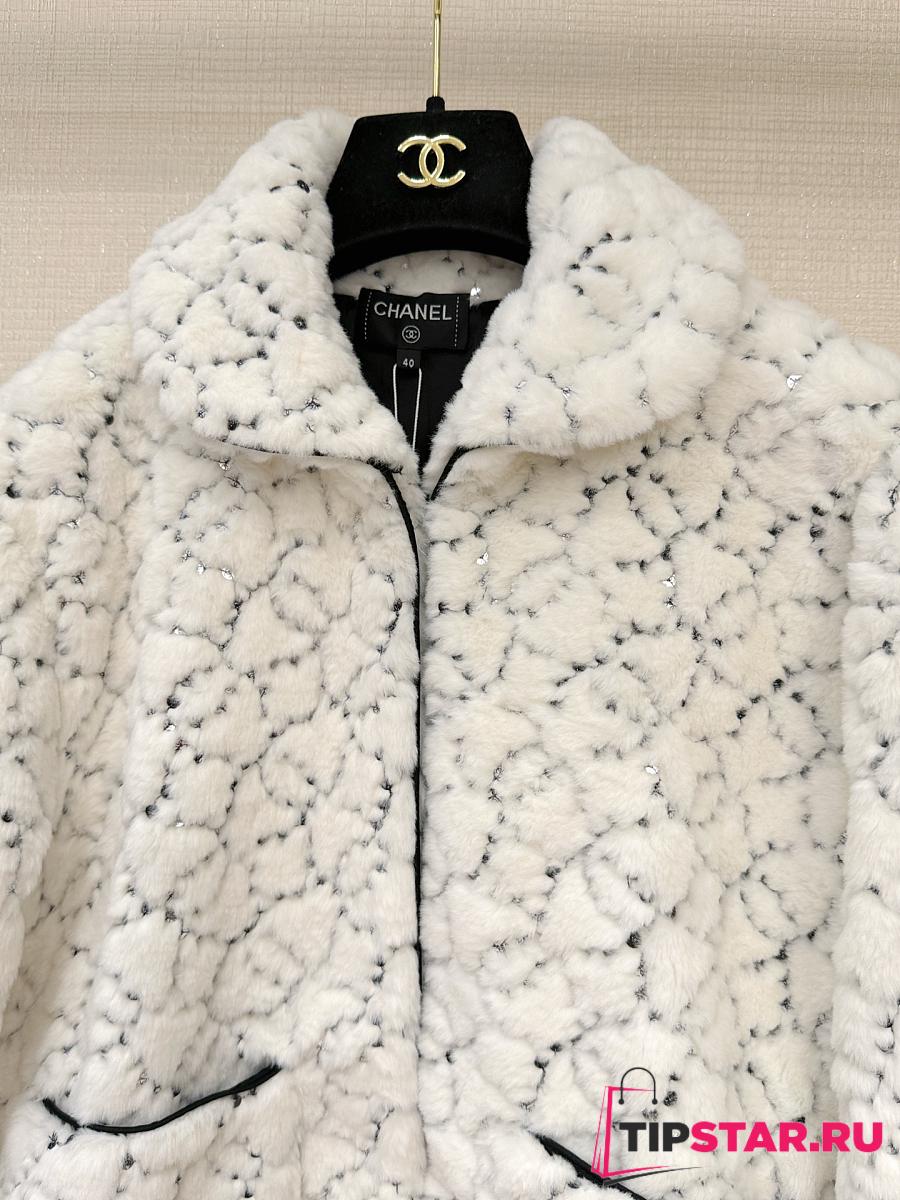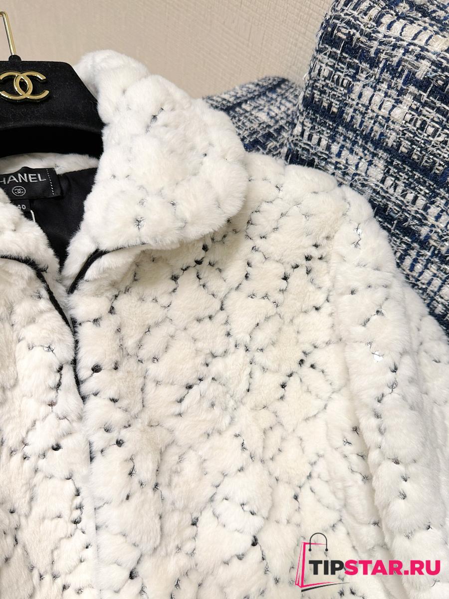 Chanel Sequin Logo Faux Fur Collar Jacket with Hook and Loop Design White