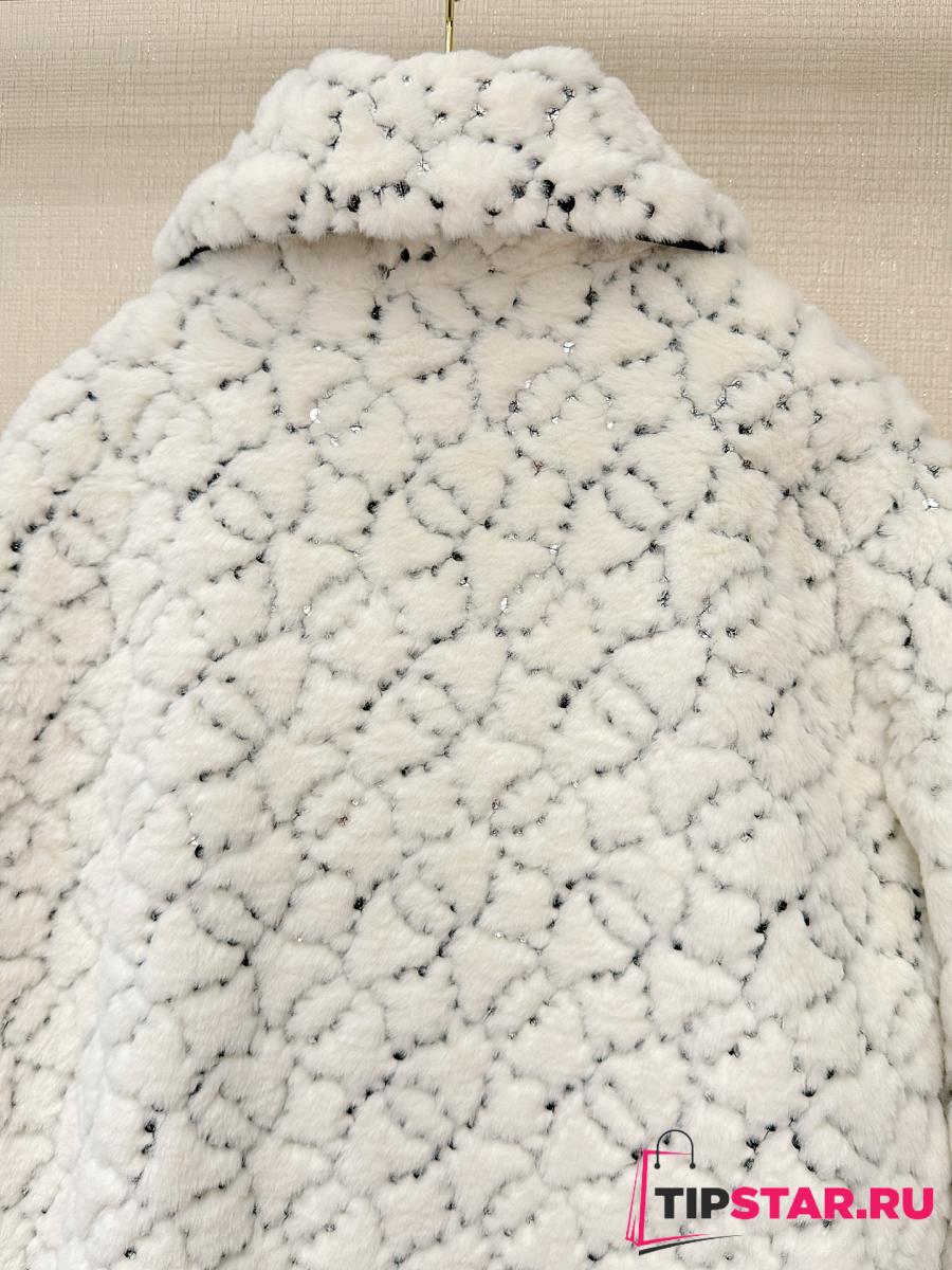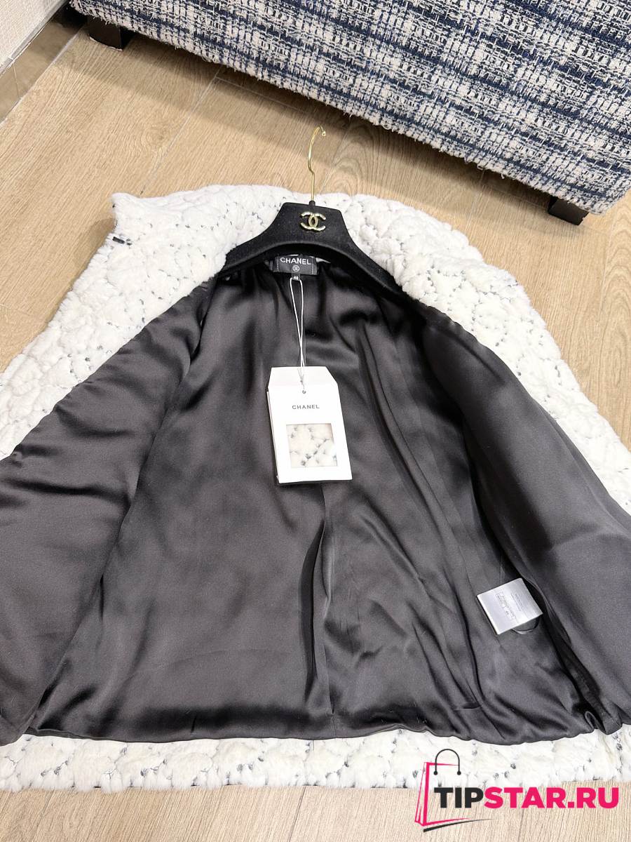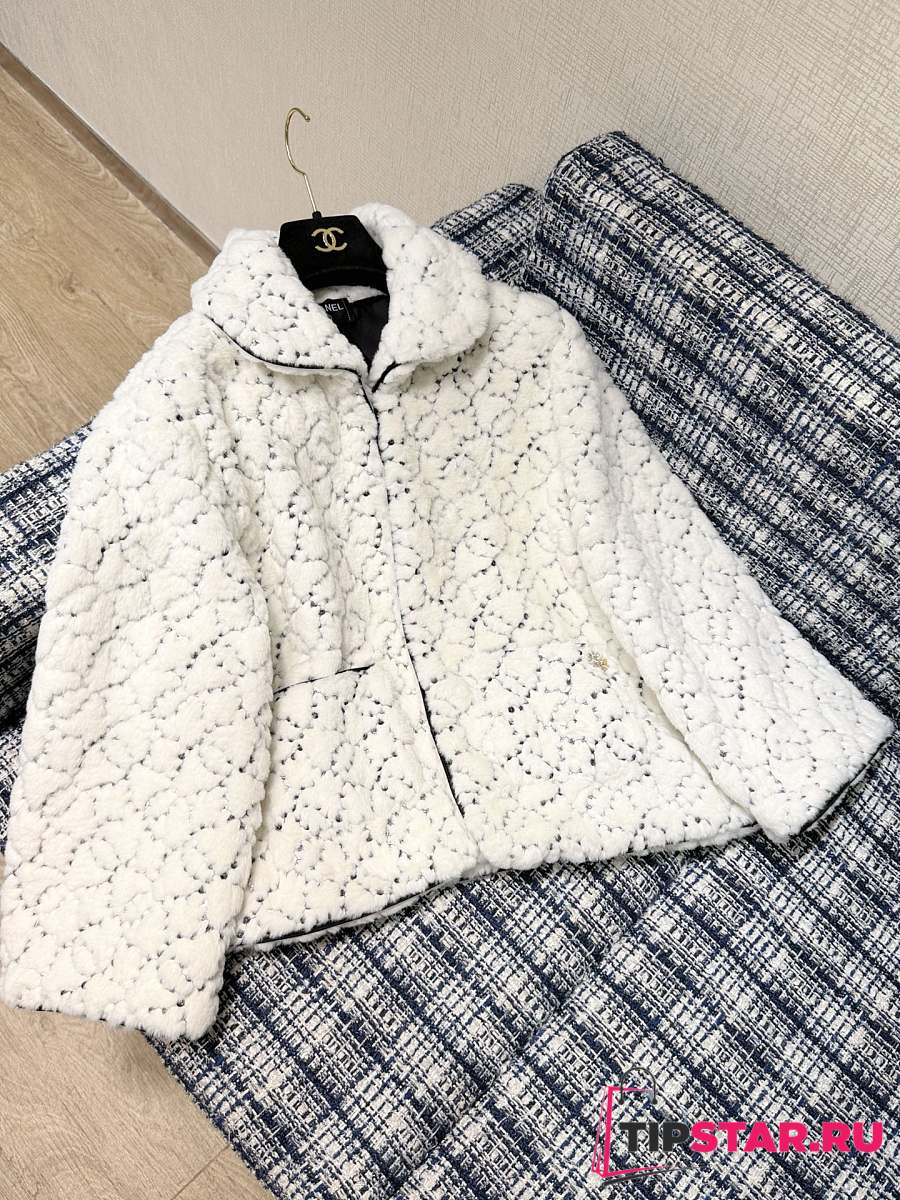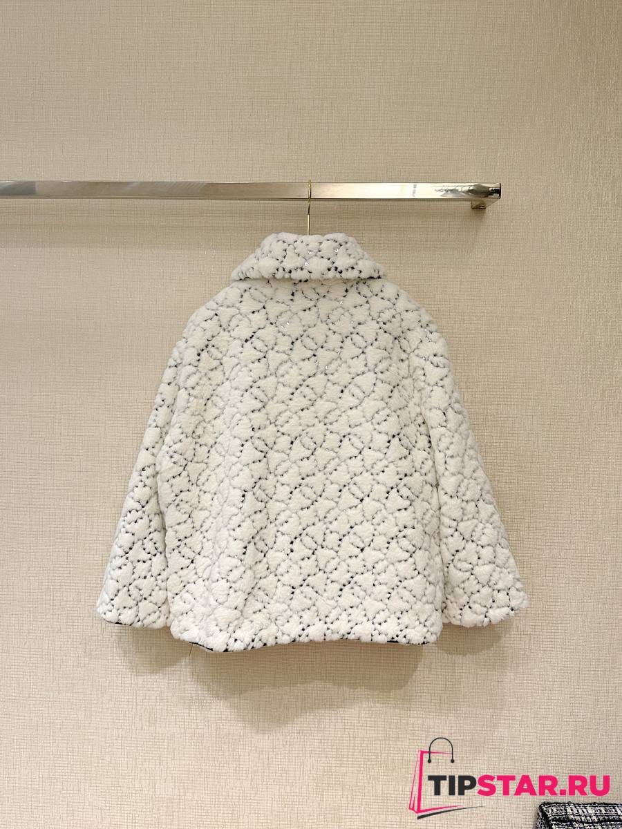 Chanel Sequin Logo Faux Fur Collar Jacket with Hook and Loop Design White
