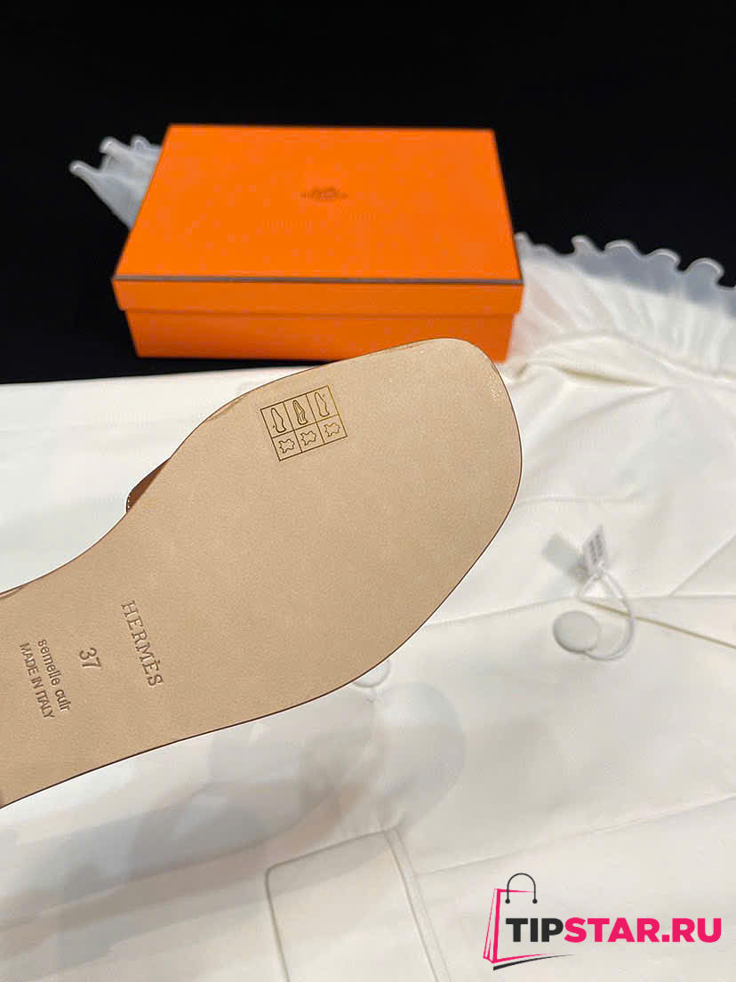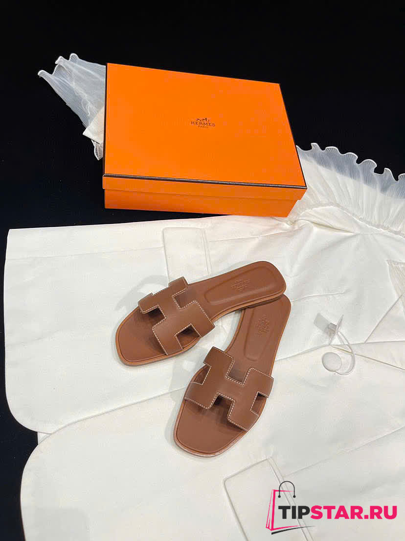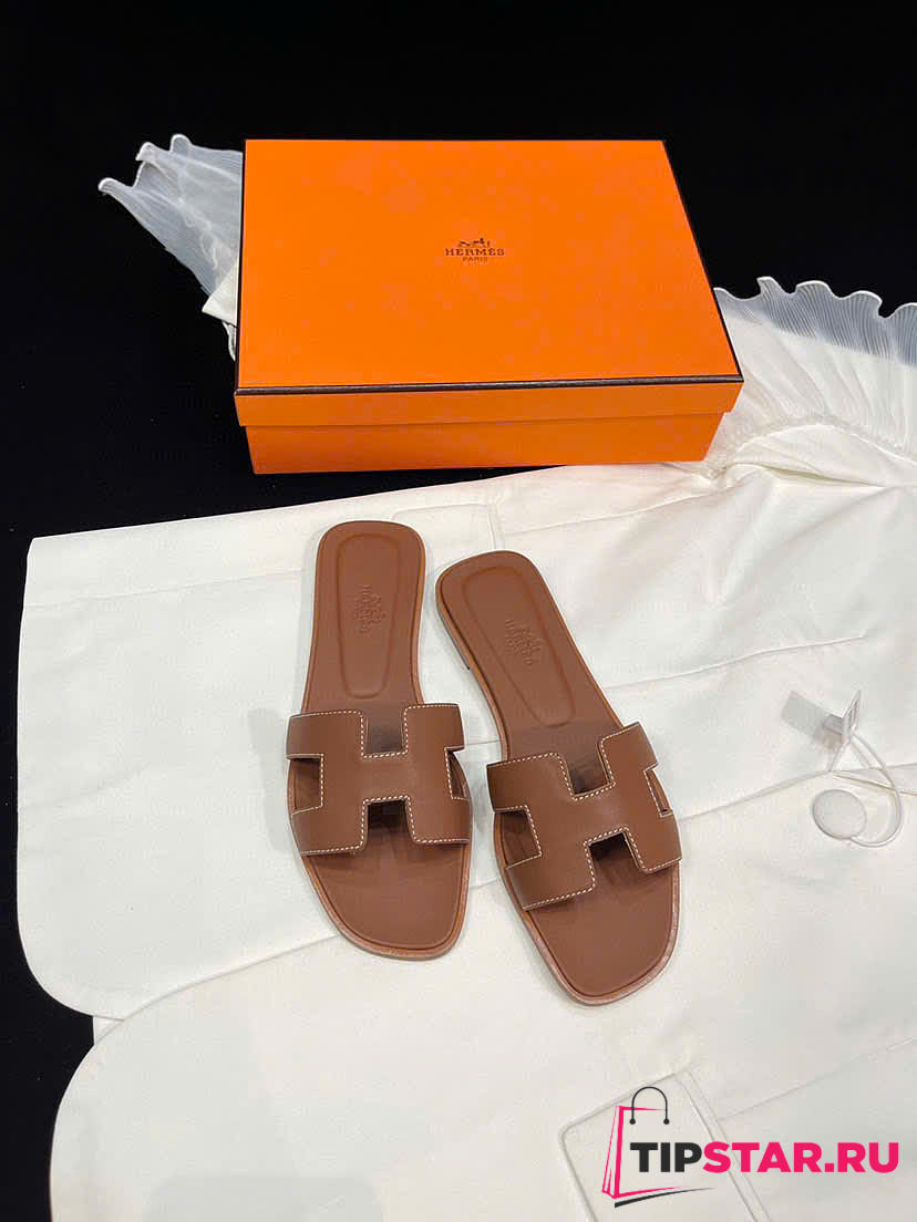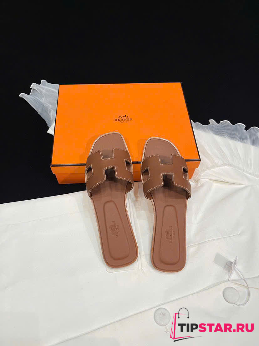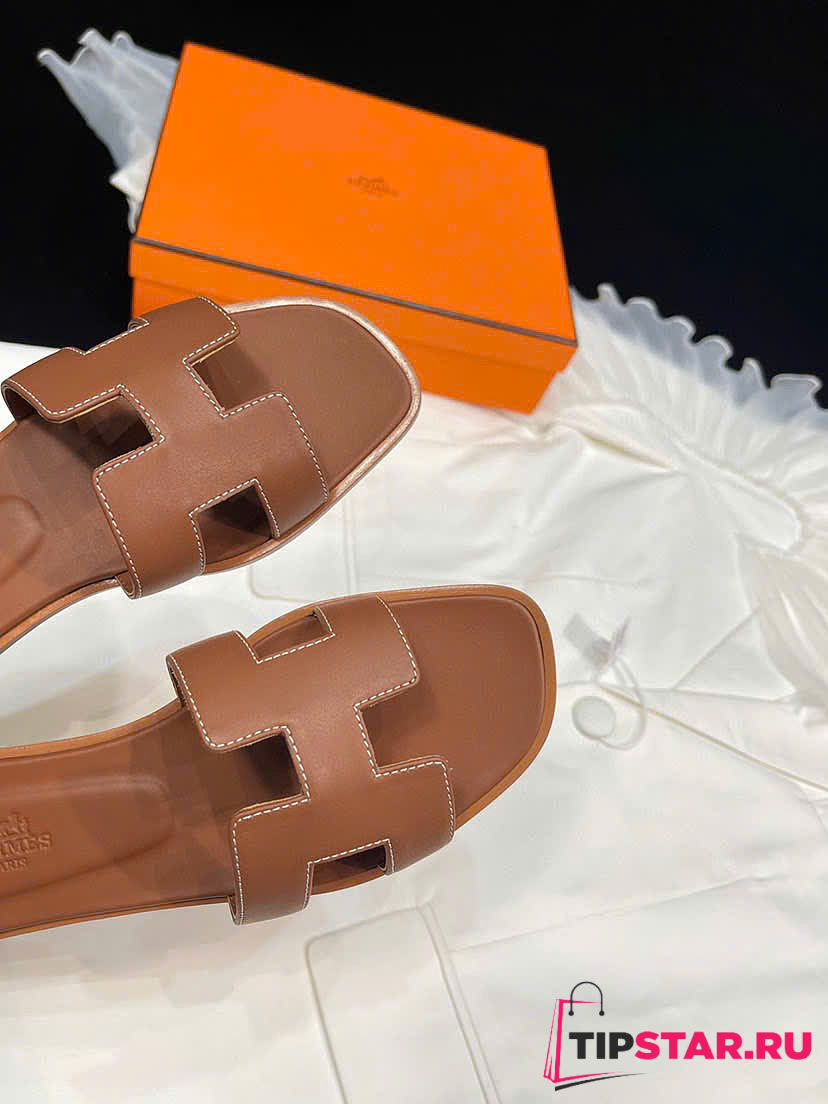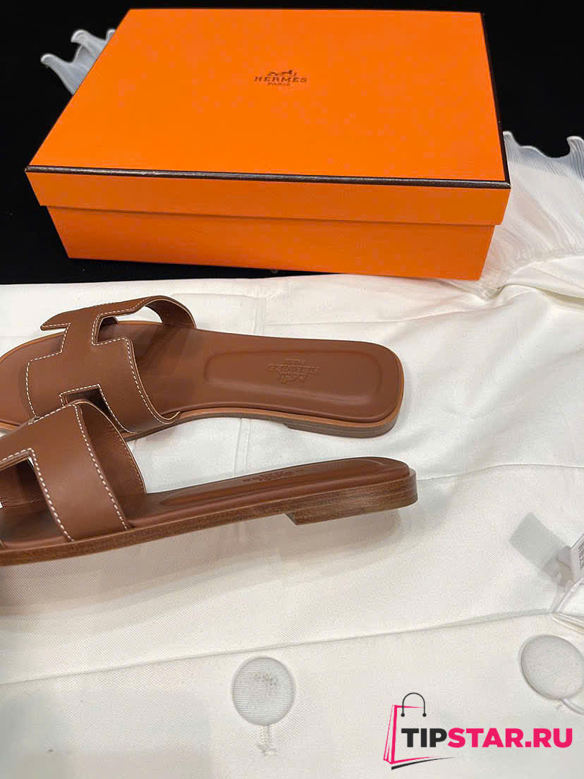 Hermes Brown Leather Oran Flat Slides