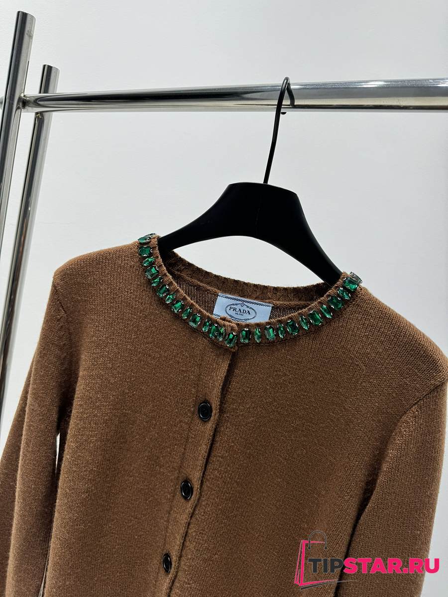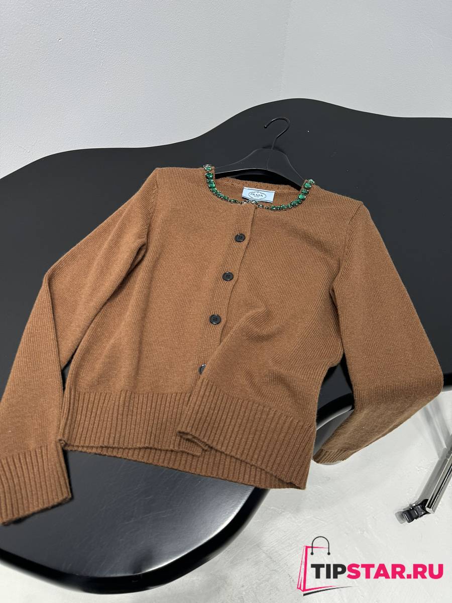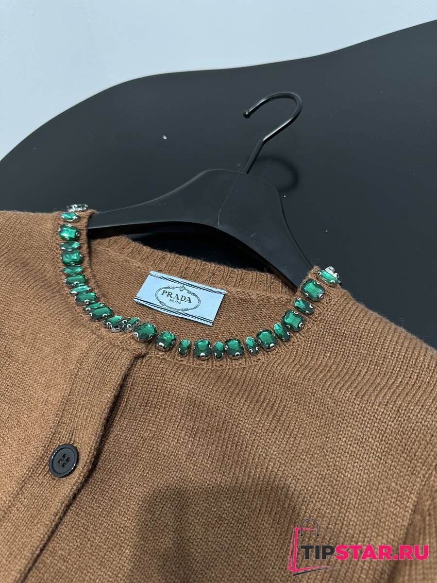 Prada Wool Rhinestone Crew Neck Cardigan Brown