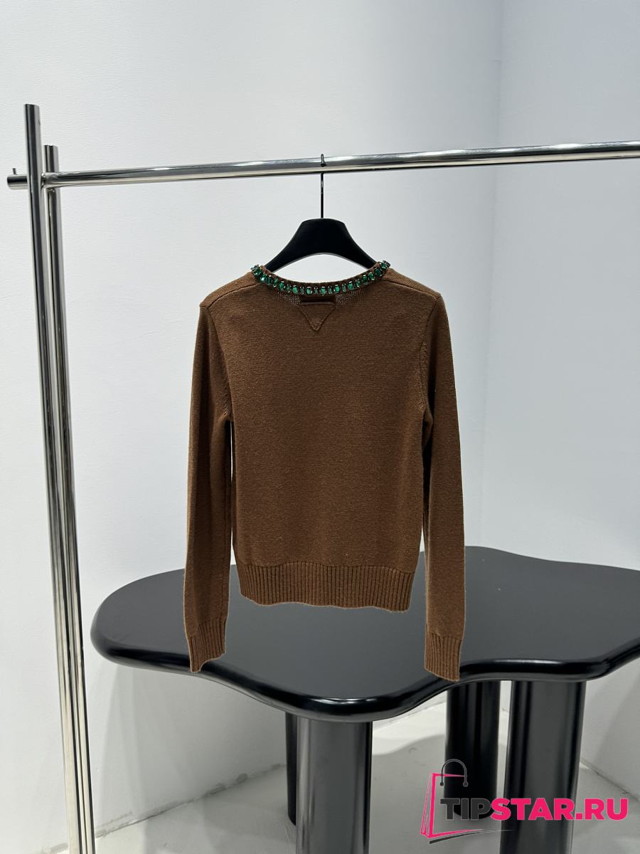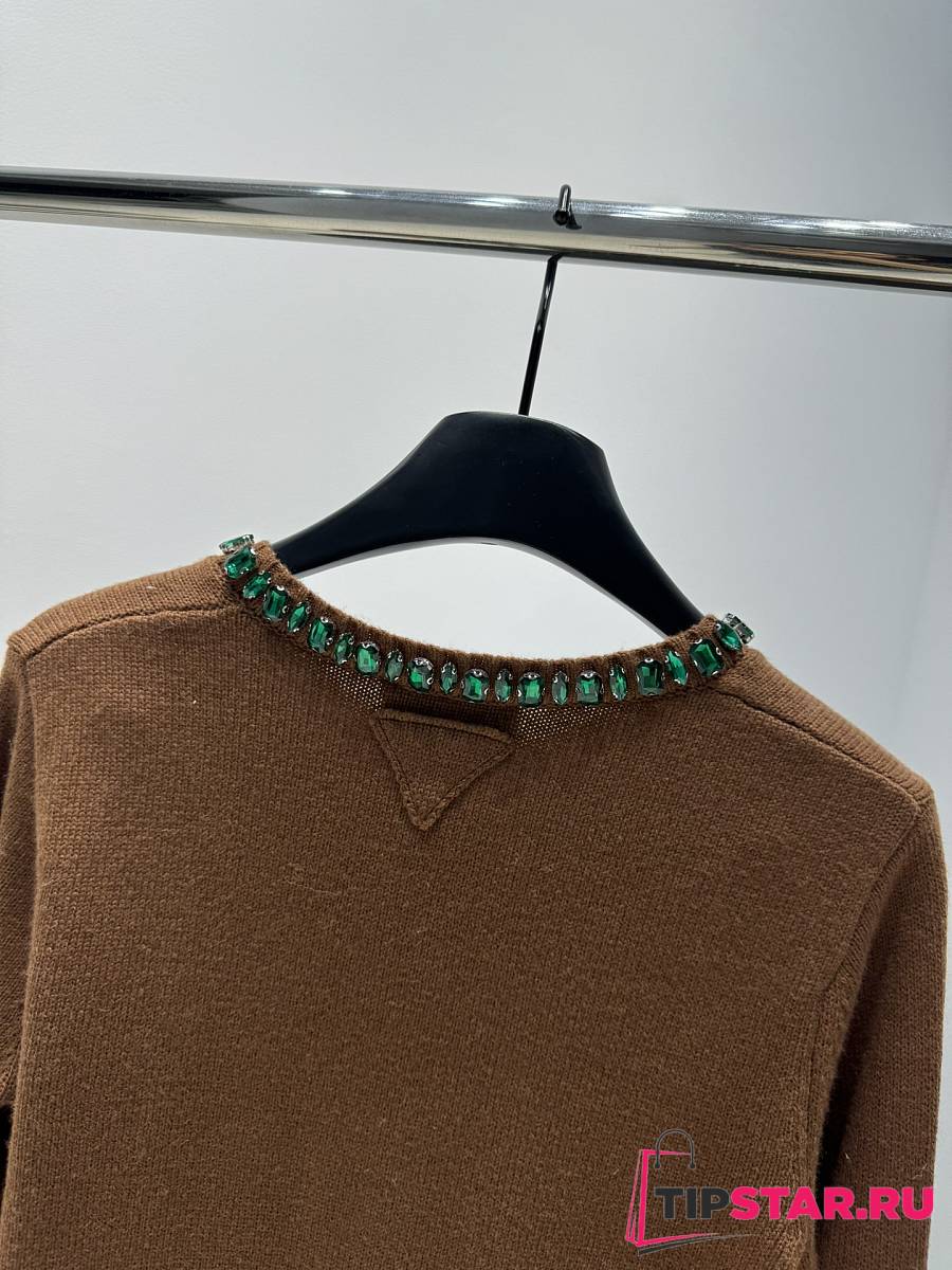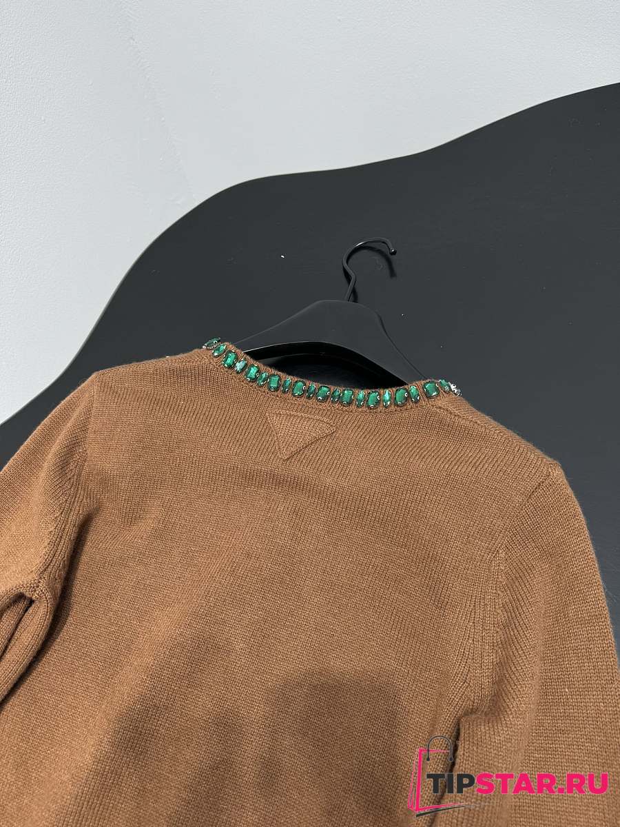 Prada Wool Rhinestone Crew Neck Cardigan Brown