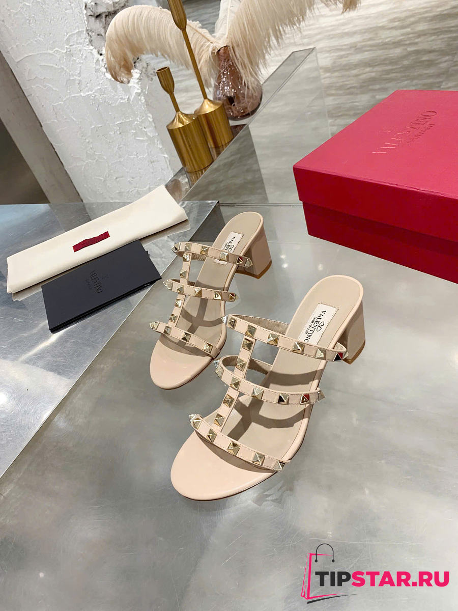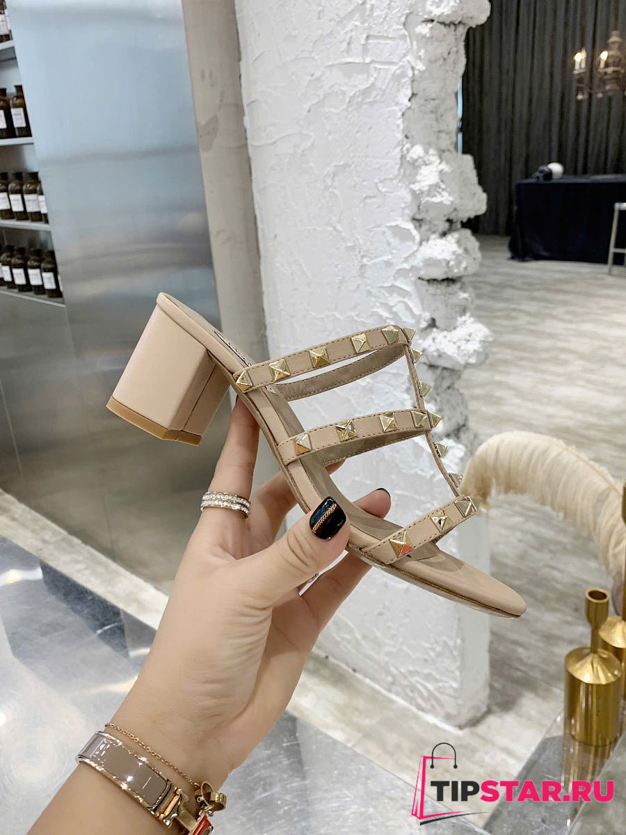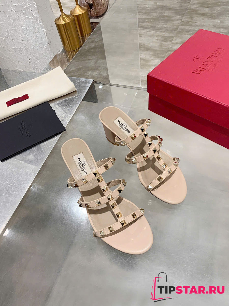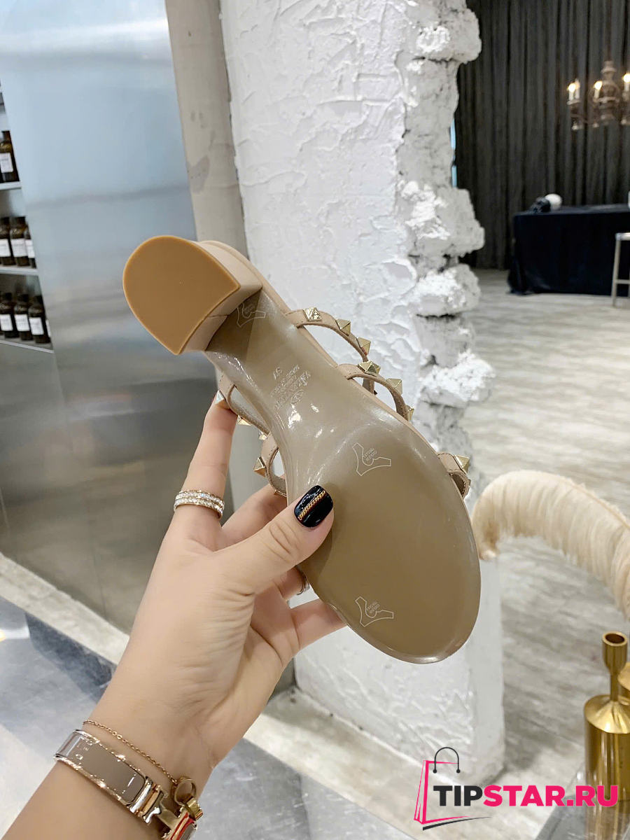 Valentino Rockstud Calfskin Leather Slide Sandal Beige